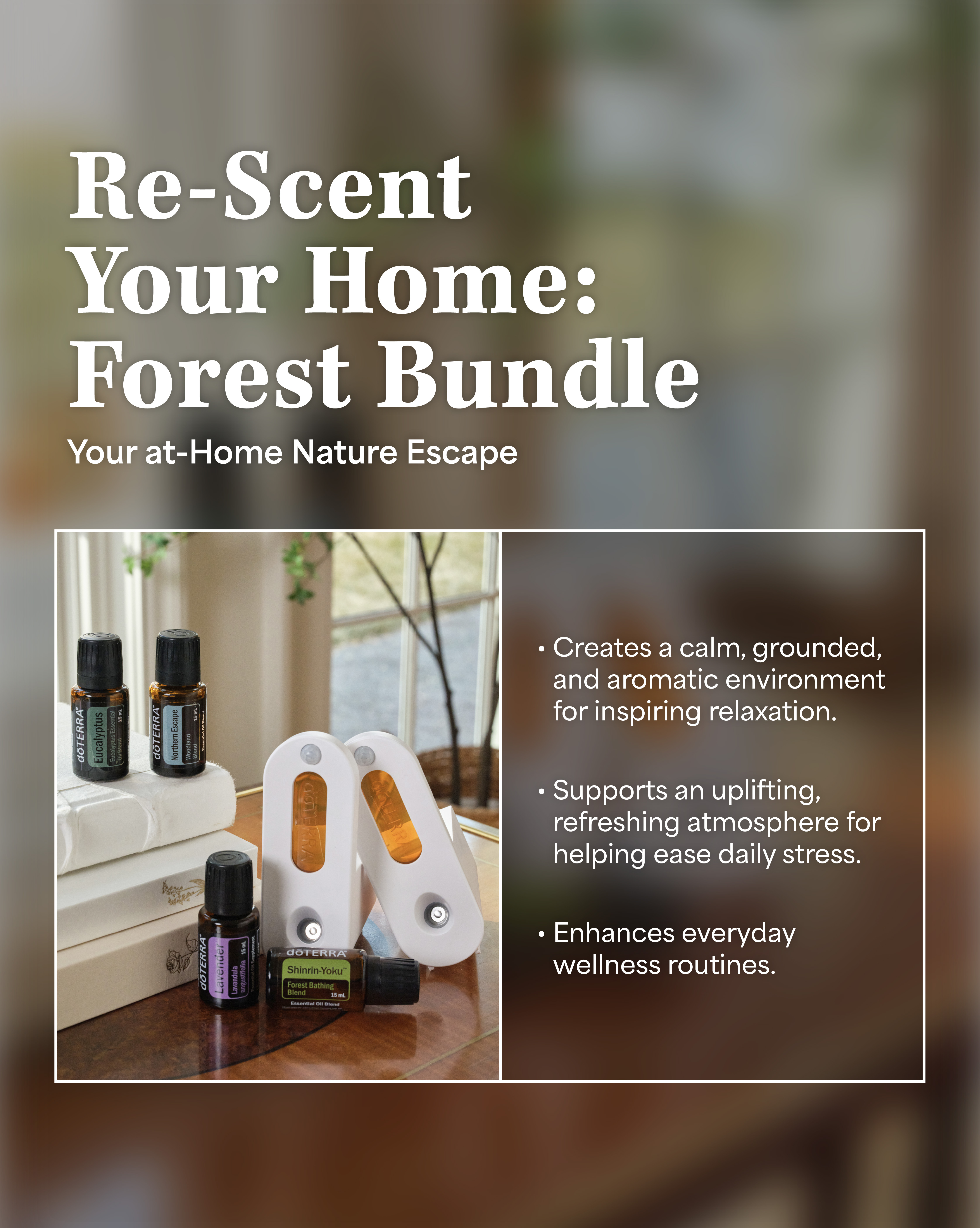 This Forest Bundle is easy to diffuse throughout the day, helping you feel more centered and at ease in your space. These grounding aromas help occasional stress relief and relaxation, bringing a steady, calming presence into your space whenever you need it.